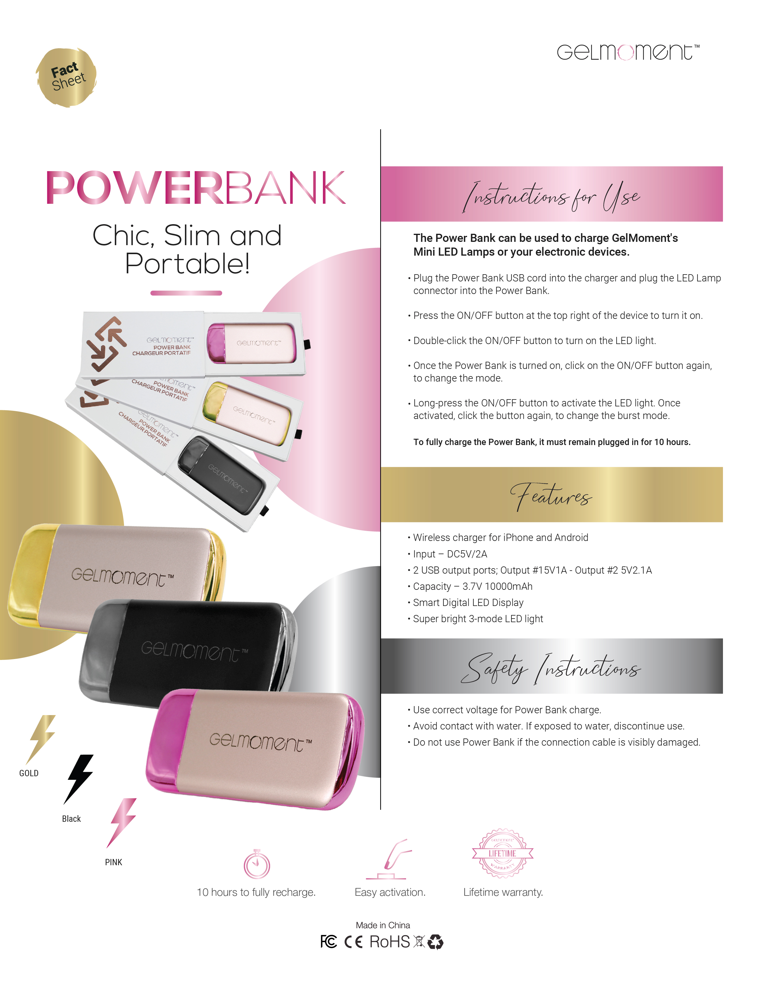 This GelMoment branded Power Bank will be an eye-catching conversation starter wherever you go. Perfectly sized to fit into your Beauty Bag, purse, or the pocket of your favourite jeans, this Power Bank packs a punch!
